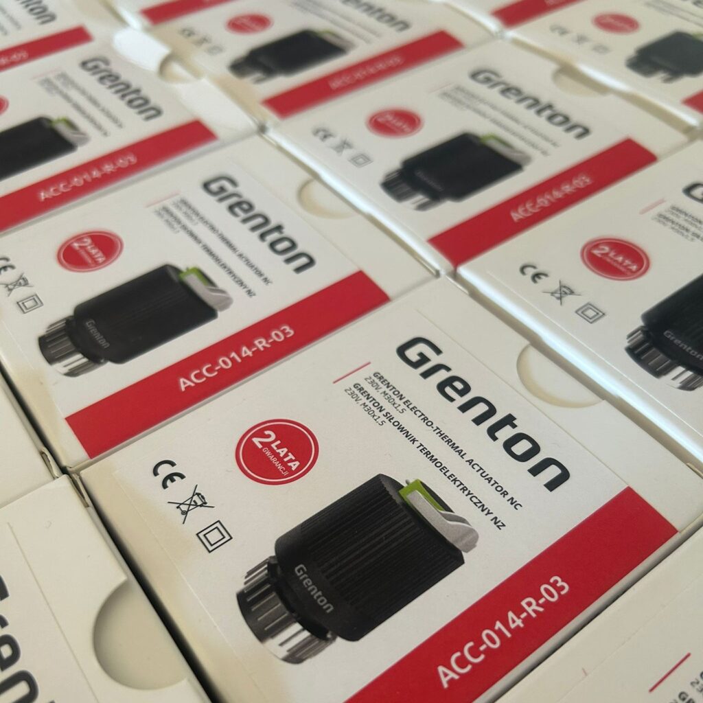 Chcesz mieć idealną temperaturę w każdym pokoju? Na zdjęciu nasz sprawdzony wybór: siłownik termoelektryczny Grenton (M30x1.5). To te niewielkie elementy na rozdzielaczu wykonują najważniejszą pracę, dawkując ciepło do poszczególnych pętli.