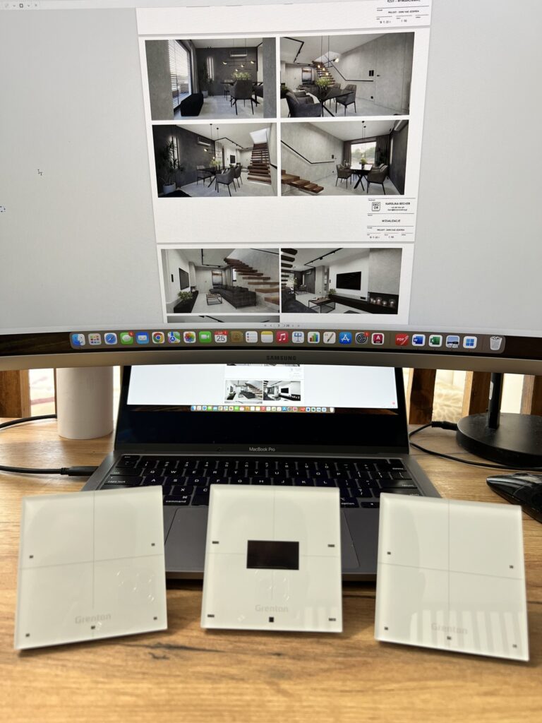 Dziś w biurze praca wre nad koncepcją. Na zdjęciach możecie zobaczyć, jak ożywiamy wizualizacje od architektów. Te eleganckie, szklane panele na biurku to inteligentne włączniki Grenton z wbudowanymi czujnikami i ekranami OLED – to one będą „centrum dowodzenia” dla domowników.